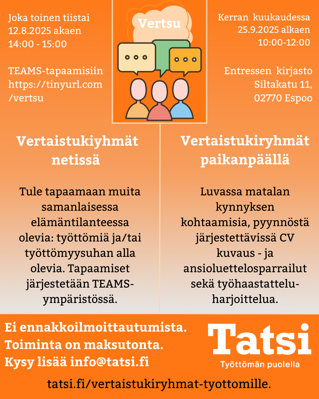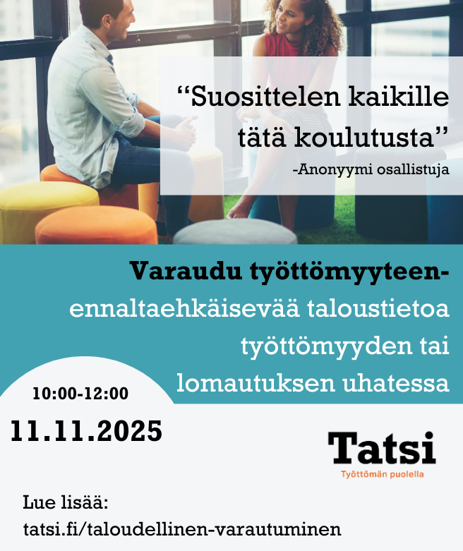 tatsiry Tatsi on työttömän puolella! Tatsi tukee, auttaa ja palvelee ammattiliittoihin kuuluvia työttömiä. Tule mukaan toimintaan! Tatsi on mukana vuoden 2025 Megarekryssä. Nähdä Osallistuiko "Millaiseen työllistymistäsi ja hyv Tatsi täyttää ensi vuonna 30 vuotta, jonka kunn Työttömyys voi olla välillä vähän liiankin t Kirjoituksia työttömyydestä – Kokemusta vaadita Etsitkö uusia ideoita työnhakuun, mutta kaipaat Seuraa