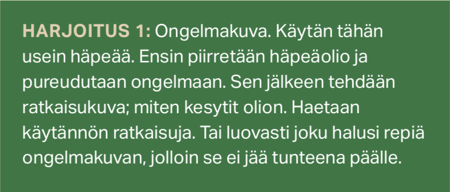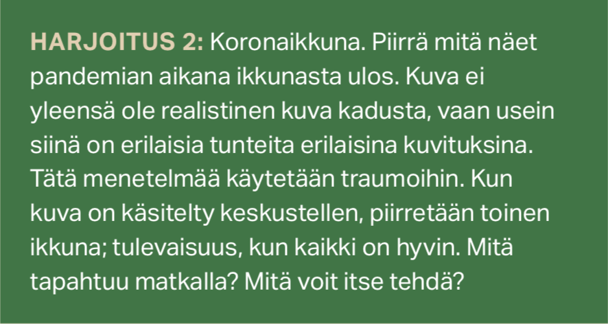 Sana taideterapia voi jollekin kuulostaa vaikealta lähestyä. Sen tekeminen taas voi yllättää helppoudellaan. Yksinkertaisuudessaan siinä piirretään ja jutellaan, mistä sitten voi aueta melkein mitä vain ajatuksia ja oivalluksia. Teosta tutkitaan yhdessä, mutta asiakas oivaltaa itse. Kuva ei kuitenkaan ole diagnosointiväline. Viitekehyksenä toimii ratkaisukeskeisyys.