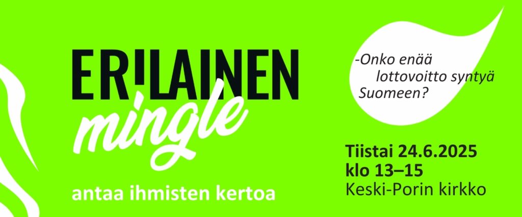 Jo 9. kertaa järjestettävän Erilaisen mingle- kohtaamistapahtuman teemana on vuonna 2025 Onko enää lottovoitto syntyä Suomeen? Osallistu vastaamalla kyselyyn siitä, mitä tekisit jos saisit juuri nyt 800 euroa ylimääräistä rahaa. Keräämme vastauksia tilaisuuden paneelikeskustelua, vaikuttajien kohtaamisia sekä päättäjille lähtevää tiedotustyötämme varten. Voit vastata kyselyyn täältä!