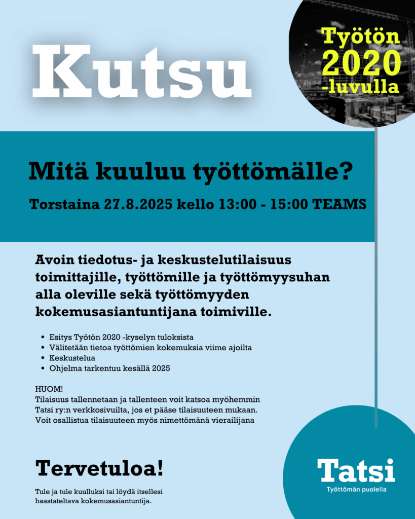 Tervetuloa syksyllä jo toiseen järjestettävään avoimeen tiedotus- ja keskustelutilaisuuteen toimittajille, työttömille ja työttömyysuhan alla oleville, sekä työttömyyden kokemusasiantuntijana toimiville keskiviikkona 27.8.2025 kello 13:00 alkaen.