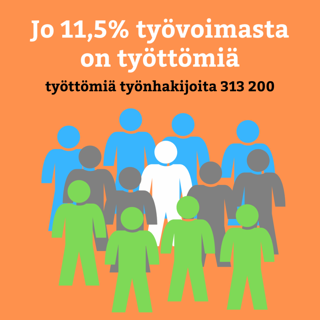 ”Se on 37 900 enemmän kuin vuotta aikaisemmin. Edelliskuusta työttömien työnhakijoiden määrä laski 7 200:lla. Työttömien työnhakijoiden osuus työvoimasta oli 11,5 prosenttia, eli 1,2 prosenttiyksikköä korkeampi kuin vuosi sitten.
