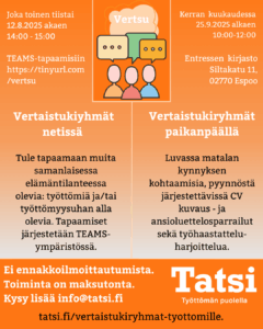 Vertaistukiryhmät työttömille- tervetuloa tapaamaan muita samanlaisessa elämäntilanteessa olevia: työttömiä ja/tai työttömyysuhan alla olevia, joilla on toiveena työllistyä seuraavien kuukausien aikana. Vertaistukiryhmissä on paikalla kokemusasiantuntija.